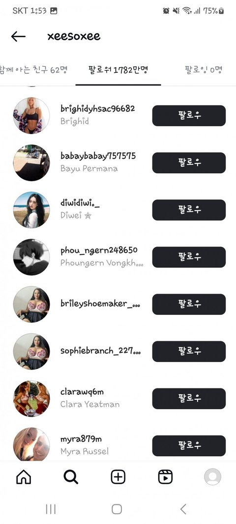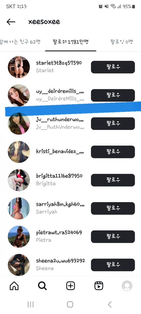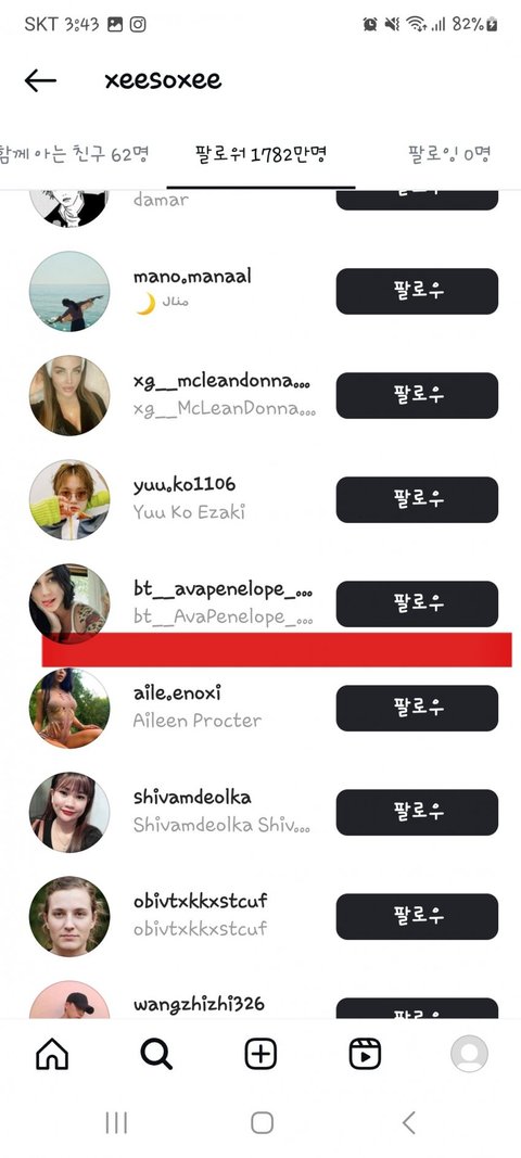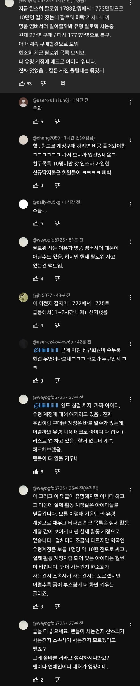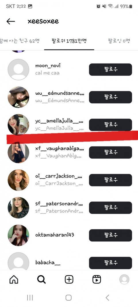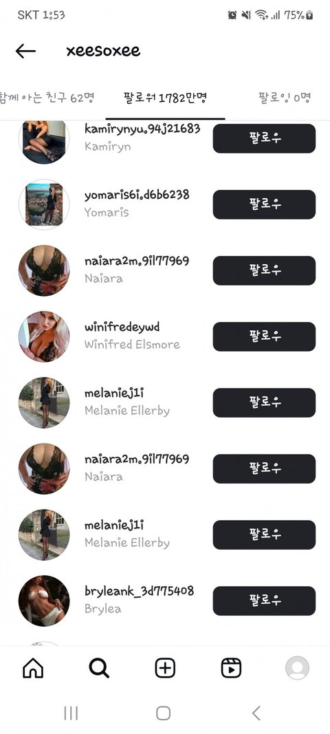 미안한데 저런 계정은 다른 연예인들 팔로워 목록에도 다 있음 ㅋㅋㅋㅋ 이젠 하다하다 팔로워 산다는 헛소리도 퍼뜨리네 줌마들 진짜 이때싶 단체로 쳐돌았나봄