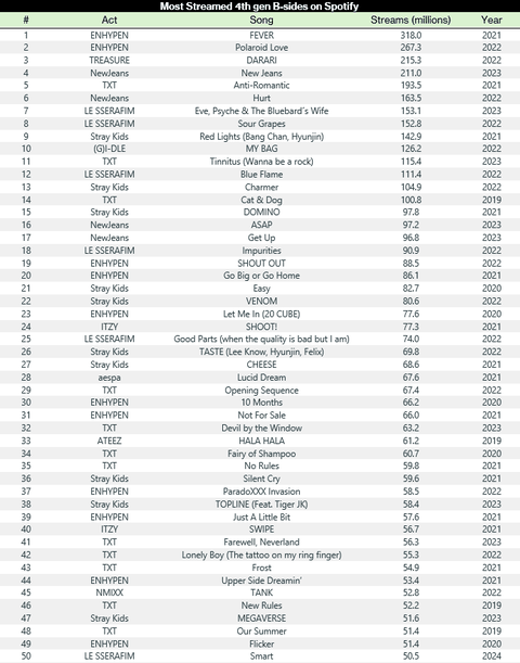 투바투 12곡 엔하이픈 11곡스키즈 10곡르세라핌 6곡뉴진스 4곡 있지 2곡트레져, (여자)아이들, 에스파, 에이티즈, 엔믹스 1곡