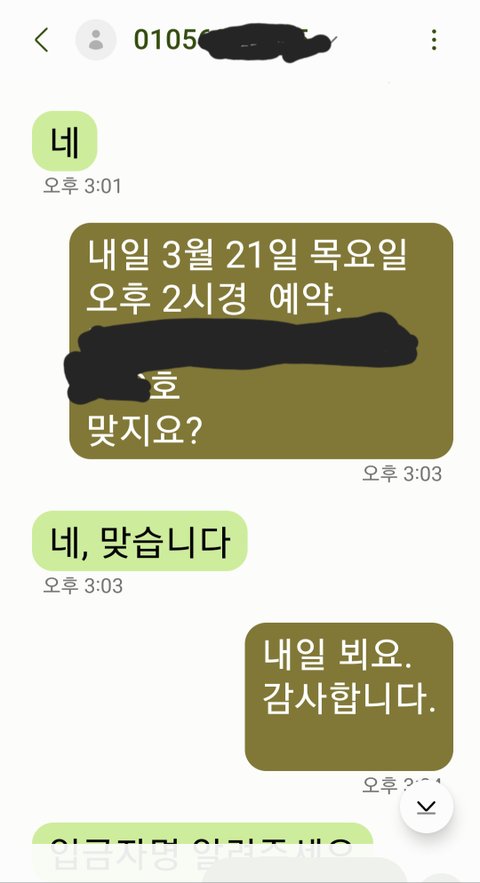 문자로 송금확인을 하면서 21일 오후 2시 예약 맞냐고 했더니 '네, 맞습니다' 답변도 왔고, 예약내용이 담긴 계약매용도 문자로 왔어요.