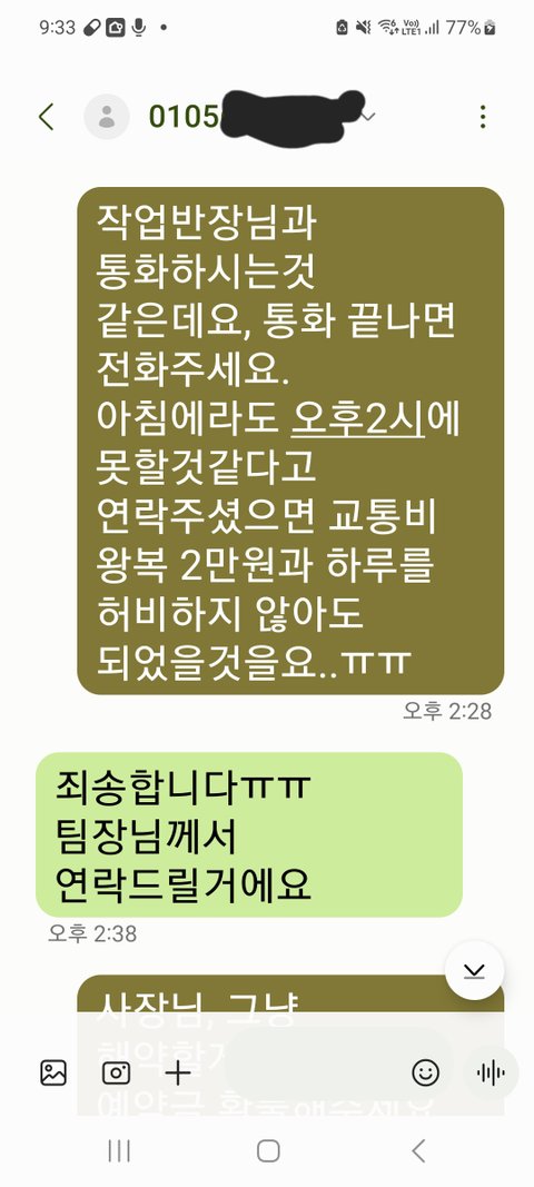 통화한 업체대표가 전화 3번만에받더니 어제저녁에 반장이랑 통화 안했냐, 반장에게 전화드리라하더니, 반장이란 사람이 내일 몇시에 가면되냐더군요. 오늘(21일) 오후2시 예약인데 뭔소리냐했죠.