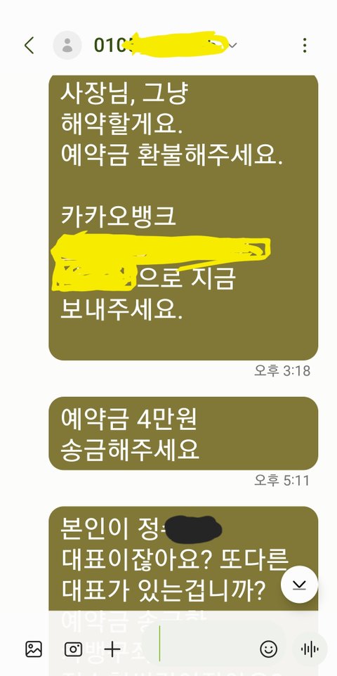 예약금받은 대표란 여자는 잘못했다고 정말 미안하다고, 잘못했다해놓고 예약금은 못주겠답니다. 업체 잘못이니 예약금 환불해달라고 했더니 대표와 상의하고 연락준다며 전화를 끊더라구요. 그러고는 전화를 안받네요.