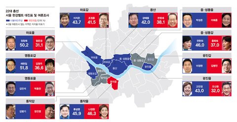 한강벨트 중에서도 여야가 핵심 승부처로 꼽는 동작을에서 류삼영 민주당 후보와 나경원 국민의힘 후보가 오차범위 내에서 접전을 벌인다는 여론조사 결과가 나와 달라진 분위기를 보여줬다. 리서치뷰가 3월16~17일 실시한 여론조사 결과 나경원 46.3%, 류삼영 45.9%로 0.4%포인트 격차의 초박빙 양상이다. 일주일여 전인 10~11일 코리아리서치가 실시한 여론조사에서는 나경원 50%, 류삼영 37%로 오차범위 밖 13%포인트나 벌어졌던 격차가 사라진 것이다. 여권에서 서울 대표주자인 나 후보가 정치 신인인 류 후보와 접전을 벌이게 된 상황을 두고 국민의힘의 수도권 위기론에 힘을 싣는 분석이 많아졌다.