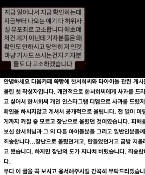 최조유포자라는 사람이 한서희 및 아이돌들한테 사과한 글과 당사자도 허위사실이라고 고소하겠다고 하고 제왑도 사실인거 마냥 우기는 안티들 고소한다는데도 제 3자인 정병들만 계속 우기고 앉아있음ㅋㅋ고소받는게 만만한건가?ㅉ그리고 안티들 한서희가 사실인데 구라라고 말하고 다녔다 거리는데 한서희에 대해 찾아보니깐 한서희 기사내는것도 안무서워하고 기사내 ╋╋╋들 거리면서 다 떠벌리거나 안효섭때는 아니라고 말한게 아니라 주작임ㅋㅋ이런식으로 두루뭉실하게 말했구만..안티들은 혼자 뭐래는거임ㅉ그리고 그 톡 보면 올때 이름 대고 오라면서 유주입니다 거리는것도 말이 안맞고 실물 직접 본 유튜버도 키 크다는데 172이라는것도 애초에 말이 안되구만..그리고 복근도 배가 홀쭉하지 않고 탄탄해야 하는데 길티영상이나 라이브영상 보면 현진이 배는 홀쭉했었음