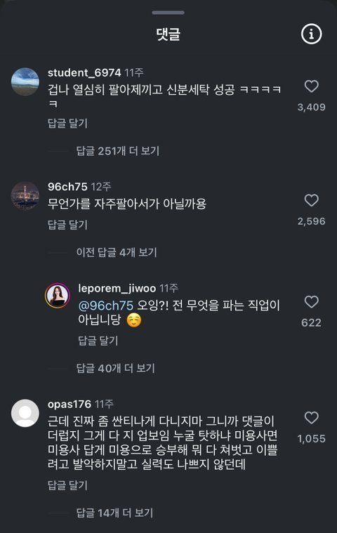 성공한 미용사분 릴스인데 댓글 하… 이쁘고 잘난여자 까내리는거 한남이ㅜ더 하다니깐 공개ㅜ인스타에서도 저ㅈㄹ인데 지들 음지커뮤에선 더 하겠지