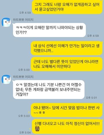 추가글 남겼는데 무슨 이유에선지 본문이 삭제됐네요.어제 글 남기고선, 댓글들 읽고 오해 풀어보려고 연락해봤는데본인이 안그래도 밥 한번 사려고 했다며 되려 본인이 기분 상하다는 식이네요.주변인들 포함 저희 친언니에게까지 연락해서 저희를 이상한 사람으로 몰아가네요.카톡은 저 뒤로 1이 없이지지 않고 있습니다 ㅋㅋ 차단당한것같아요~어쨌든 남겨주신 의견들 다 감사합니다. 제가 틀린 생각을 가지고 있던건 아니었네요.