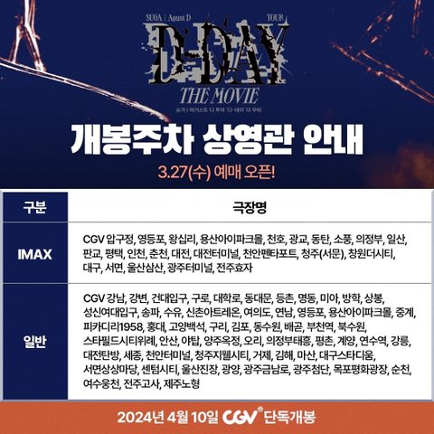 방탄 슈가 <Agust D TOUR 'D-DAY' THE MOVIE> 3/27일 예매오픈,상영관 안내