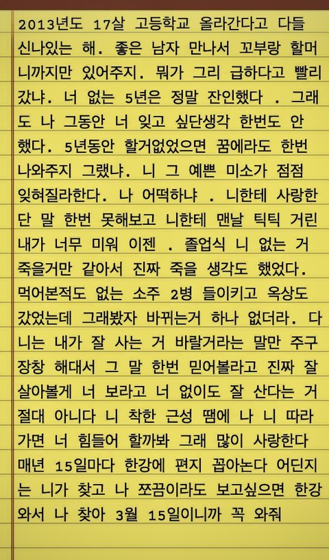 남자친구가 술 마시고 울어대면서 메모장 보고있길래 장난으로 뺏어봤어 근데 내용이 짝사랑 상대가 17살 때 세상을 떠났대 그 상대 따라가려는 시도도 해봤는데 그럼 짝사랑 상대가 죄책감 들까봐 살고 있다는 그런 내용이었어 사는 김에 그 상대보라고 잘 살겠다 뭐 그런.. 사진 첨부할게