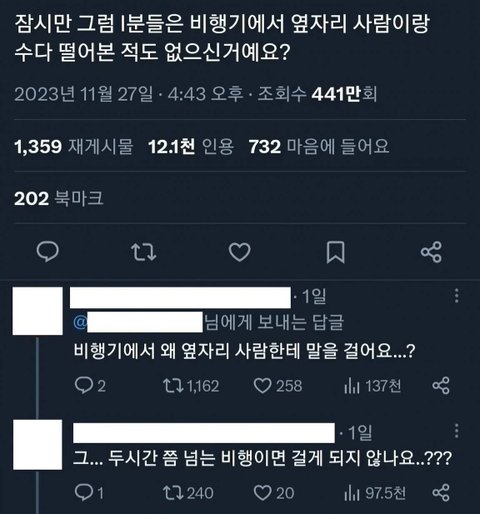 외향인들아..니네 다들 뱅기 옆에 앉은 분한테 말 거는 거 가능해?내가 내향인이라서 못하는 건거