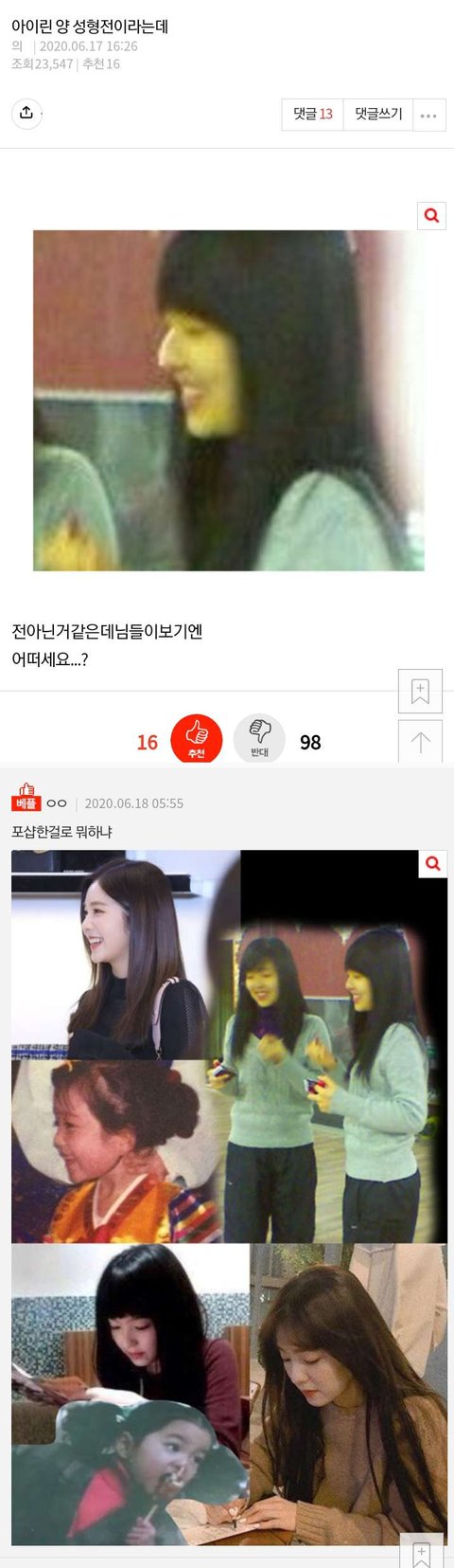 아이린 어릴때부터 대칭이라 지금 정석미인으로 불리는건데 ㅋㅋ 얼마나 열등감이 심하면 얼굴 늘리고 한쪽눈 줄인 짝눈을 조작한게 진짜라고 믿고싶나봄