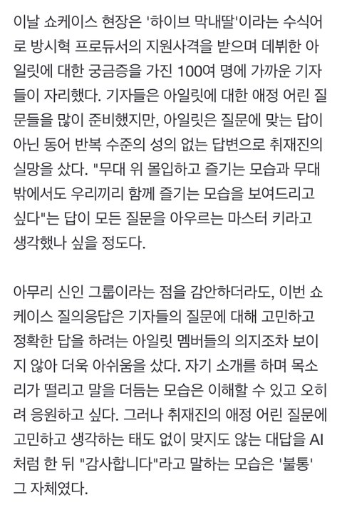 하이브레이블+신인이라 웬만하면 안좋은말 안할텐데 얼마나 무성의하고 대충 대답한거임?