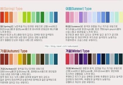아니 퍼컬을 왜 돈주고 진단받아? 다들 집에 얼굴닦는 수건 많지? 수건 장 뒤져서 찐한 자주색(와인색) / 쌩 화이트/ 누리끼리한 아이보리화이트/ 파스텔 핑크/ 희멀건 하늘색or 민트색/ 우중충한 (회색섞인) 퍼런색/ 밝은 뻘건색/ 누런끼 엄청들어간 똥색/ 주황색/ 어두운 회색 한장씩 꺼내와봐. 거울앞에서 머리 앞머리없게 싹 뒤로 까서 꽉 묶고 얼굴 밑에 수건 깔별로 한장씩 대보면 적어도 내가 무슨색을 댔을때 제일 그나마 얼굴이 덜 화나보이고 덜 푸르죽죽한지는 딱 나옴 예를들어 내가 파스텔색깔 댔을때 ㅈㄴ 얼굴 뻘개보이고 찐자주색이나 우중충한 파란색 찐회색 대면 어? 얼굴에 붉은끼 갑자기 좀 덜 빨개보이고 그렇다고 푸르죽죽 환자같은느낌도 아니다? 그럼 그색깔이 내 퍼컬에 ㅈㄴ가까운것임 제일 잘받는 색 수건 딱 골라쥐고 퍼컬 차트에서 내얼굴에 잘 받는 그색깔이 제일 많이들어있는 영역이 어디냐를 보면 바로 자기 계절 나오지. 나는 이방법으로 내가 겨쿨딥이라는것을 찾아냄(추가:밑댓들/ 아 집에 수건 색깔이 많이 없어???그럼 집에 굴러다니는 옷중에 (내꺼없으면 엄마 언니 동생 아빠꺼라도) 티셔츠 후드티 뭐 옷중에 저런 색깔 대충 꺼내 모아서 대봐 그것도 효과는 똑같음 하다못해 배 사과박스 포장용 보자기같은것도 괜찮음)