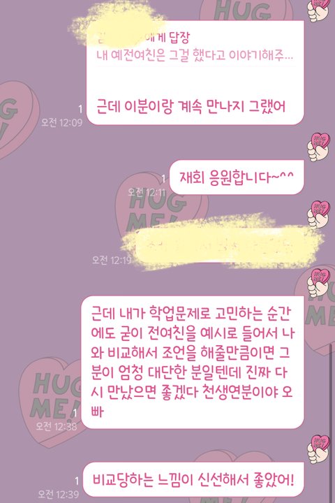 전에 전여친얘기 처음 했을땐 아무렇지 않았는데 왜 괜히 내가 고민중일때 굳이 전여친을 예시로 들고와서 노오오력을 하라고 그러니까 비교당하는 기분ㅜㅠㅜ