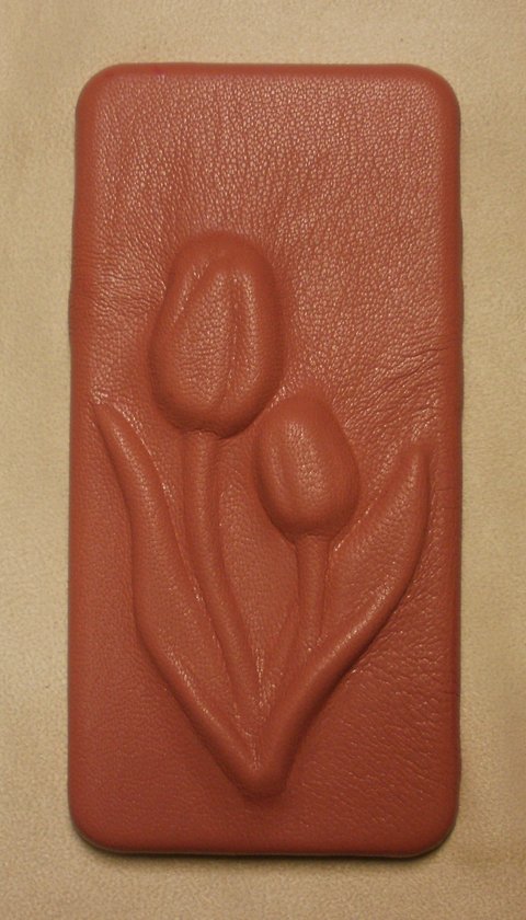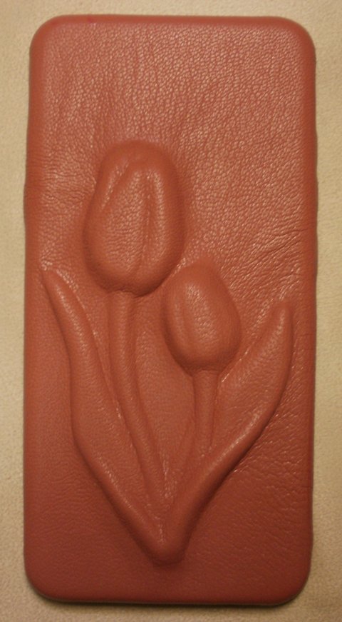 핑크 컬러 양가죽으로 튤립 디자인을 양각 엠보싱 처리하여 제작한 폰 케이스입니다.(마디샤)