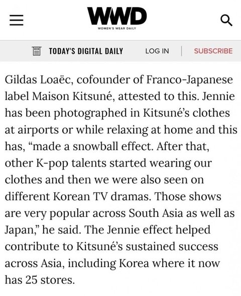 메종 키츠네 CEO : 제니가 입으면서 다른 아이돌이나 연예인들이 입기 시작했고 유명해졌고 브랜드 지속적인 성공에 기여했다