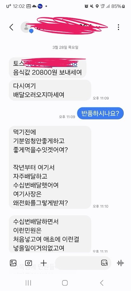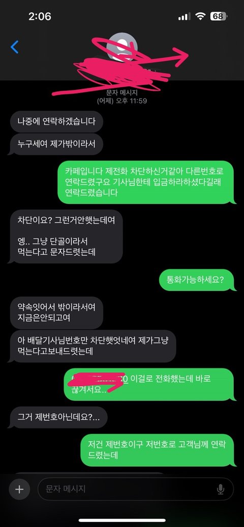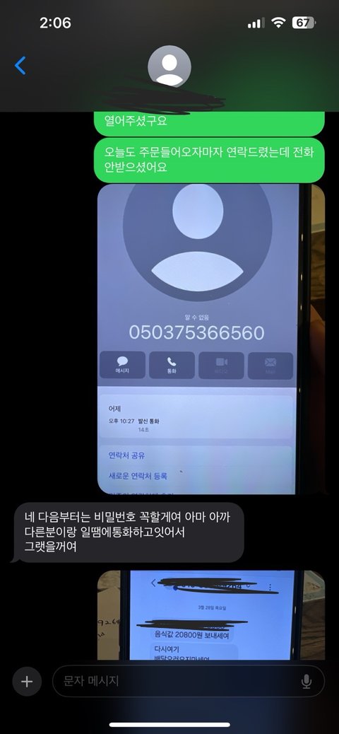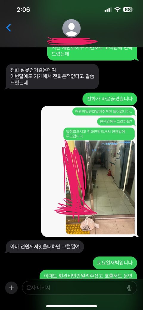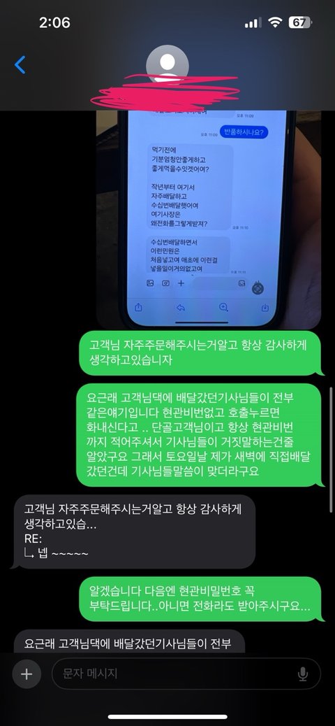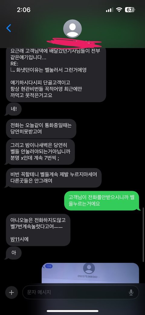 저희가게에 배달플랫폼으로 자주 주문해주시는 고객님이 계십니다.이 고객님은 항상 문앞에두세요 벨x노크x 입니다. 이집은 현관비밀번호를 눌러야 들어갈수있는 구조입니다.그전에는 그러지않았는데 최근들어 요청사항에 현관비밀번호를 적어주지않으십니다.그런데 고객님은 전화를 안받으세요. 현관비번도없고 전화도안받으시고 호출누르면 화를내시고 안열어주십니다. (기사님한테들음)최근 토요일 오전02:00쯤 주문이 들어왔고 제가 직접배달을갔습니다. 요청사항엔 비밀번호가없었고 전화를받지않으셨습니다. 호출을 누르니 정말 기사님말씀대로 화를내시더라구요... 문앞에 두고가라고요!!! 라는 소리를들었고 다시한번 전화를하였지만 받지않았습니다. 15분을 전화도해보고 문자도해보고 기다리다 현관앞에두고 사진찍어서 보내드렸구요... 여기까지는 문제가없었습니다.그런데 오늘 목요일밤 11시쯤 또 주문이들어왔습니다. 현관비밀번호는 역시 없었구요, 저는 토요일날 그런일을 제가 겪었으니 주문이 들어오자마자 전화를하였습니다. 받지않으셨구요... 문자도보냈습니다.현관비밀번호알려달라고..... 결국 답은없고 배달기사님한테 이사실을 전하였습니다.잘갔거니 하고 하던일을 하고있는와중에 매장으로 전화가옵니다.왜 벨을누르냐며... 화를내십니다. 그전에 있던일도 말씀드리며 왜 현관비밀번호도 안적으시구 연락도 안받으시냐 ,호출하면 화만내시고 왜안열어주시냐..라며 오히려 제가 여쭤봤지만 전화가오지않았다,문자가안왔다 라며 화를내십니다... 이번일은 배달기사님한테 잘 얘기하겠다, 손님도 기사님이랑 통화를해보시라 하였고손님은 배달기사한테 전화하라하세요. 라고하였습니다. 그런데!!!!! 기사님한테 연락이옵니다. 밑은 기사님과 손님이 문자한내용입니다