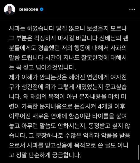 아니 근데 궁금한게 혜리랑 연락해서 뭐하게..?? 연락되면 선배님 스토리에 올린 글 재밌네 해명해주세요 이럴라구..?? 굳이 뭐하러 연락하는건지 이해안됨 어쨌든 전여친 현여친인데..