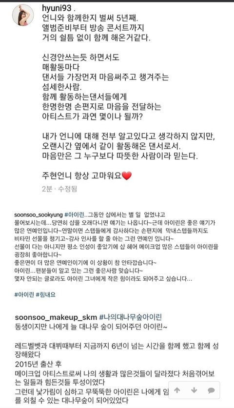 위 레드벨벳 스타일리스트,그 밑 현장에 있었던 담당 메이크업아티스트, 맨 밑 현장에 있었던 메이크업 실장 증언