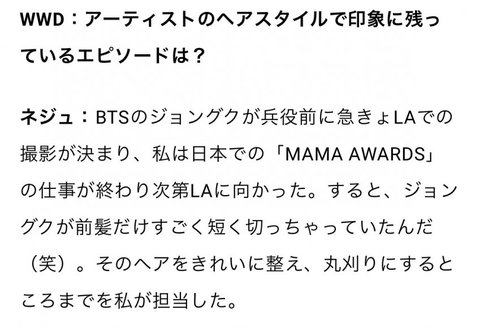 ->BTS의 정국이 병역 전에 급하게 LA에서의 촬영이 결정되었고, 나는 일본에서의 'MAMA AWARDS' 일이 끝나는 대로 LA로 향했다.그랬더니 정국이가 앞머리만 엄청 짧게 잘라놨더라고(웃음). 그 머리를 예쁘게 다듬고, 이발하는 것까지를 내가 담당했다