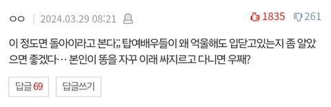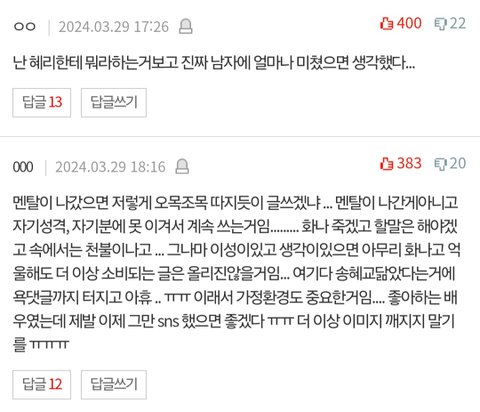 이 댓글같은 사람들이 판에서만 달겠냐 인스타 찾아가서 계속 안좋은 댓글들 달텐데 당연히 멘탈 나가지ㅋㅋ 대중들은 망가지는 연예인들 계속 보면서도 절대 안바뀜