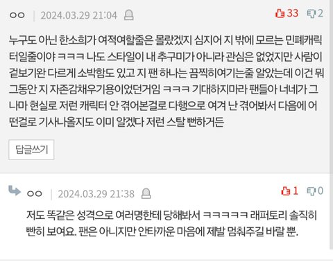 차라리 바람폈으면 억울하지도 않지 한소희 입장에서는 정말 관계 정리된 솔로인 남자랑 마음 맞아서 만난건데 바람 환승 취급 당하는 데 억울해 죽을 마음일거임 근데 사람들도 환승은 아닌 거 알겠으니 그건 언급안하고 이젠 태도로 욕하고 있음ㅋㅋㅋㅋㅋㅋ 한소희가 계속 해명문 남기는 것도 남친 지키는 게 아니라 본인은 정말 떳떳하고 잘못한 게 없다는 걸 증명하고 싶어서 인 거 같은데 참..