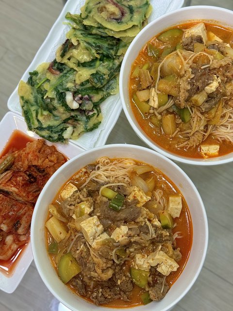 국수 삶아서 찬물로 헹군 뒤 준비하시고, 두부, 대파, 청양고추, 삶아둔 국수를 넣고 살짝 끓이면 완성!