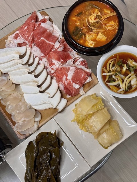 차돌박이300g, 숙주250g, 팽이버섯 한봉, 새송이버섯, 깻잎 등등