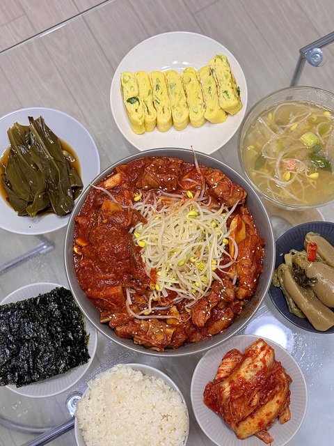 팬에 기름을 두르고 양념된 닭고기를 넣어 볶다가 양념이 살짝 타려고 할때 물 50ml정도 살짝 부어주세요~ 그리고 감자, 양배추, 떡 등 재료를 넣어 골고루 섞어주고 뚜껑을 덮어서 익혀주시면 됩니당! 마지막에 감자가 다 익으면 깻잎, 대파, 청양고추 넣고 볶아서 완성