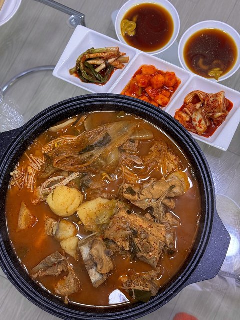 다시 2차로 등뼈 잠기게 물을 넣고(대파1, 양파1, 월계수잎4장, 통후추15알, 된장2, 맛술2) 넣고 1시간가량 푹 끓여줍니다! (묵은지 넣으실분은 중간에 넣고 끓이시면 됩니다)