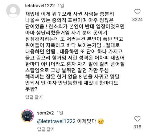 뭐 솔직히 한소희 이번 대처 미흡했던건 맞지만 저렇게까지 장문으로 부들대면서 욕하는것도 이해안되긴 함... 그냥 그만들좀 하면 안되나... 한소희도, 한소희 까는 애들도 다들 걍 그만들좀 하면 좋겠음 ㅠ