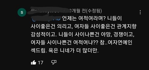 항상 그러잖아 ㅋㅋㅋ 여자들끼리 연대하면 페미고 여자들끼리 사이 안좋으면 여적여고 존 나 어쩌라는거 ㅋㅋ