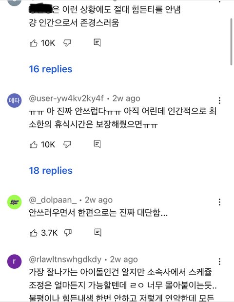 아이돌만큼 개꿀인 직업이 어디있다고 스케줄 빡센걸로 저렇게 올려치고 안타까워하냐 ㅋㅋㅋㅋ 아이돌은 무슨 일반 직업중에 더 힘든 직업이 얼마나 많은데 간호사가 훨씬 더 힘들고 안타깝고 대단하고 존경스럽지 ㅋㅋㅋ 아이돌은 돈 억단위로 벌지만 간호사는?