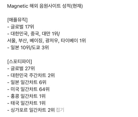 스포티만 높은게 아니니까…우리나라뿐만 아니라 여러 나라에서 차트 상위권임 설마 ㅅㅈㄱ를 이렇게 많은 나라들에서 다 했겠냐,,,큐피드 만큼은 아니어도 얘네 타이틀 인기많음