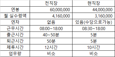 [전직장] 연봉6000, 연차없음, 체류12시간 VS [현직장] 연봉4400, 연차있음, 체류10시간