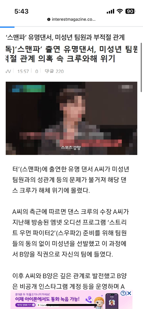 스맨파 댄서 미성년자와 부적절한 관계