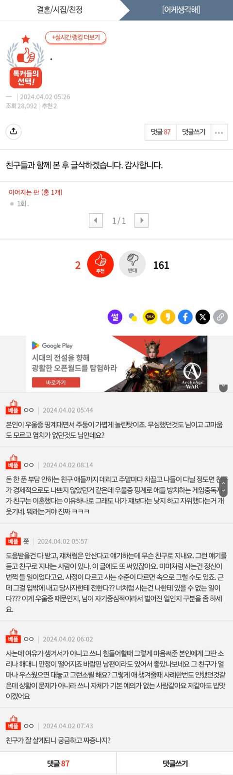 님이 먼저 선넘었으니까요... 이러이러한 점이 걱정이 된다라고만 하면되지 당신이 뭔데 당장 헤어져라 마라임..?