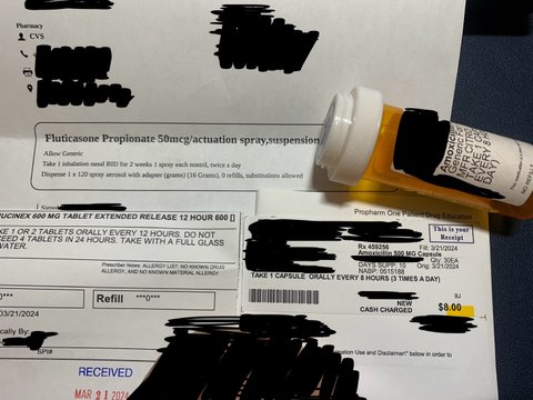 맨 처음 처방 받은 약은 제가 처방전을 버린 것 같은데, 처음에 3월 15일 그쯤 감기가 안 떨어져서 처음 병원에 갔었고, 그 때 MUCINEX 600MG 약을 처방 받았습니다. 물론 별 효과 없어서 3월 21일 다시 병원에 방문하게 되었고요. 제일 위에 보이는 CVS에서 받은 약은 바로 어제 병원에서 처방받은 약입니다. 이번엔 조금 큰 병원을 방문했는데, 알레르기성 비염, 위염이 함께 온 것 같다고 갑자기 알레르기약과 위장약을 처방해 주었습니다. 코 스프레이도 같이요...