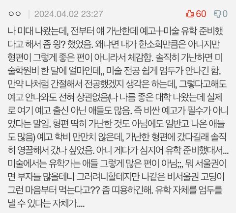나도 그렇게 생각했는데, 또 다른 글(빚투논란) 보니까 실제 미대생이 쓴 댓글인데, 확실히 가난했다면 저 분 말처럼 좀 이상한 부분은 있어서 궁금함.... 저 분이 저 댓글 쓰고나니까 또 팬들 쉴드치면서 하는 말이- 한소희는 가난한 적 없었다/가난하다고 말 한 적이 없었다(여유로웠다는 뜻) 이렇게 쉴드치는데 대체 뭐가 맞는거야 ㅋㅋㅋ 하도 보다보니 궁금하긴하네