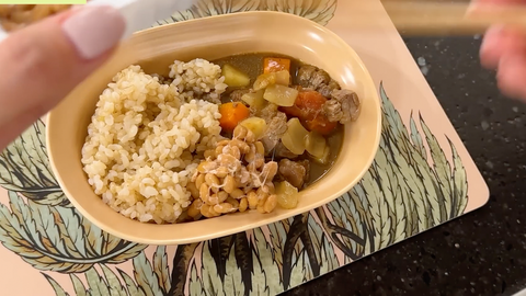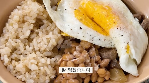 아침은 야무지게 낫토, 계란까지 올린 현미밥+카레