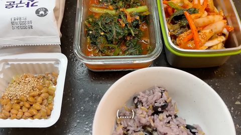 둘째날 아침은 김, 낫토, 무청김치, 소라무침, 잡곡밥