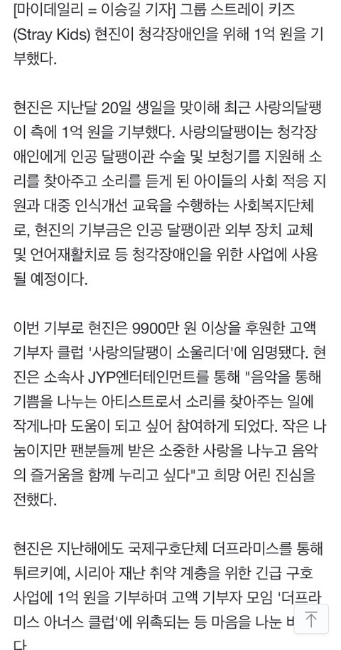 현진이 생일에 팬들도 기부 했는데 현진이도 기부하고 마음 너무 좋아 현진이만큼 큰 돈은 못하지만 작은돈이라도 어려운 사람들한테 자주 나누면서 살아야겠다는 생각들어 진짜 마음 개따뜻해져