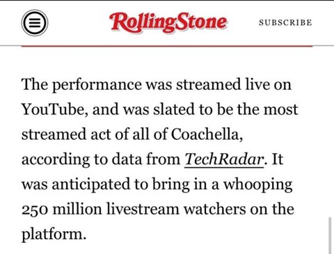 롤링스톤 피셜 블핑 2023 코첼라가 시청자수 2억 5천만 (코첼라 역대 최다)