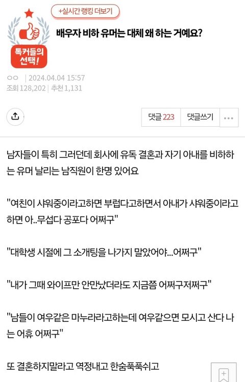 ㄹㅇ개싫어.. 뭐 아내랑 의리로 살고 아내가 여자로 안보인단 말 남한테 해서 뭐가 좋은 거임 대체