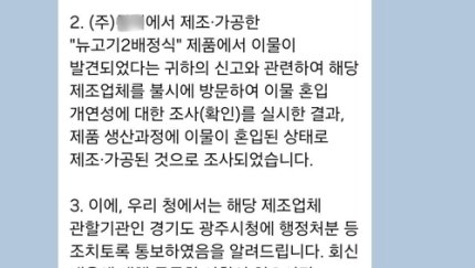 제조업체는 "음식에 이물질이 들어가지 않도록 위생관리를 철저히 하겠다"고 밝혔습니다. 경인청은 이에 따라 해당 제조업체 관할기관인 경기도 광주시청에 행정처분을 내리라고 통보했습니다.