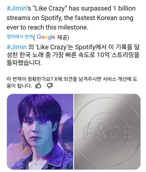 한국어 가사 곡으로 최단기간 Spotify 10억 스트리밍 돌파했다는 방탄소년단 지민 'Like Crazy'