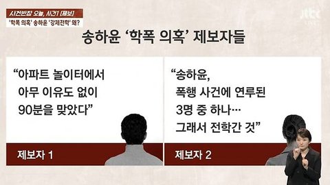 JTBC '사건반장'은 2일 송하윤이 2004년 고등학교 졸업을 앞두고 집단 폭행으로 강제 전학을 당했다고 보도했다.