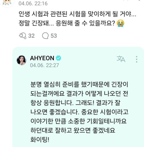팬이 위버스에 고2 생활 걱정된다고 글 남기니까