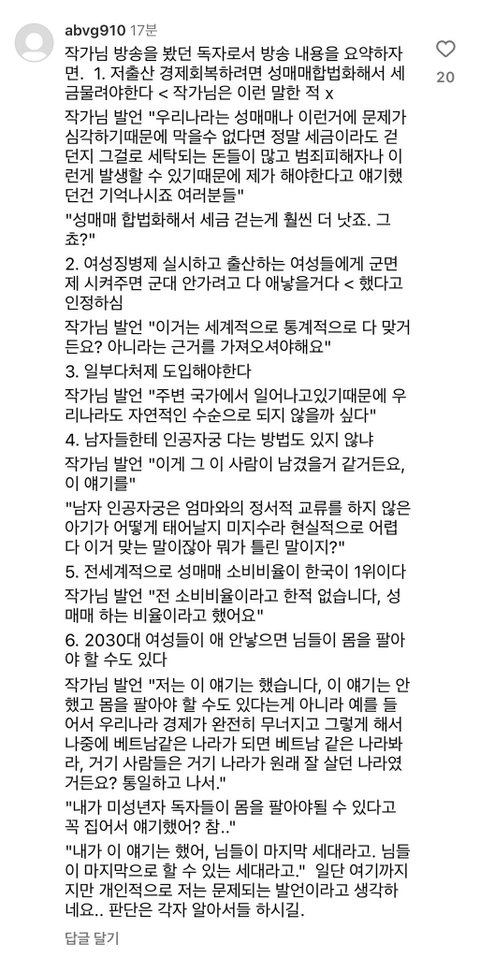 남들이 퍼오는거 안믿고 혼자 판단하려고 해명방송도 봤는데 그냥 딱 저 마인드에다가 저게 왜 잘못됐는지 모르더라 결국 팬들이랑 기싸움만 하다가 방송 끄던데 방송보고 확신했지 아 저 글에 과장이 조금 들어갔어도 저 글이랑 같은 마인드를 갖고있는게 맞구나... 내 쿠키...