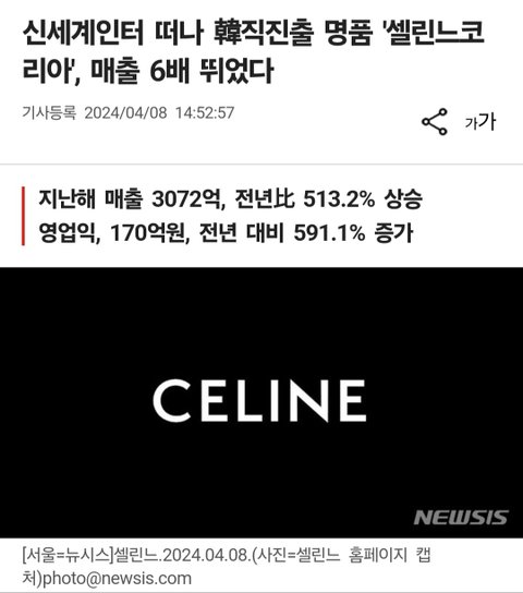 작년 영업이익 얘기고 전년대비 591.1% 증가했다고 함 매출은 6배 증가함 뷔가 재작년에 셀린느쇼 참석하고 작년부터 본격적으로 앰버서더 했으니까 뷔효과인듯?