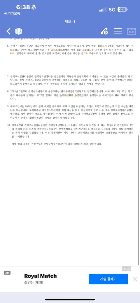 저희 관악 청소년 센터는 5년 마다 비영리 단체의 공개 입찰로 관리 업체가 운영 하게 되어있습니다. 공개 입찰 할 자격 조건 중 최고 관리자 외 근로자 고용 승계를 하겠다라는 확인서 등을 제출 하여야 합니다. 그런데 2022년 12월 29일 구청 조례를 주민 공청회등 주민들의 의견 수렴 과정 없이 절차상 하자 들이 많은 것들을 묵살하고 구청의 대행으로 공단한테 넘기 듯 관리 주최가 바뀌게 되었습니다.