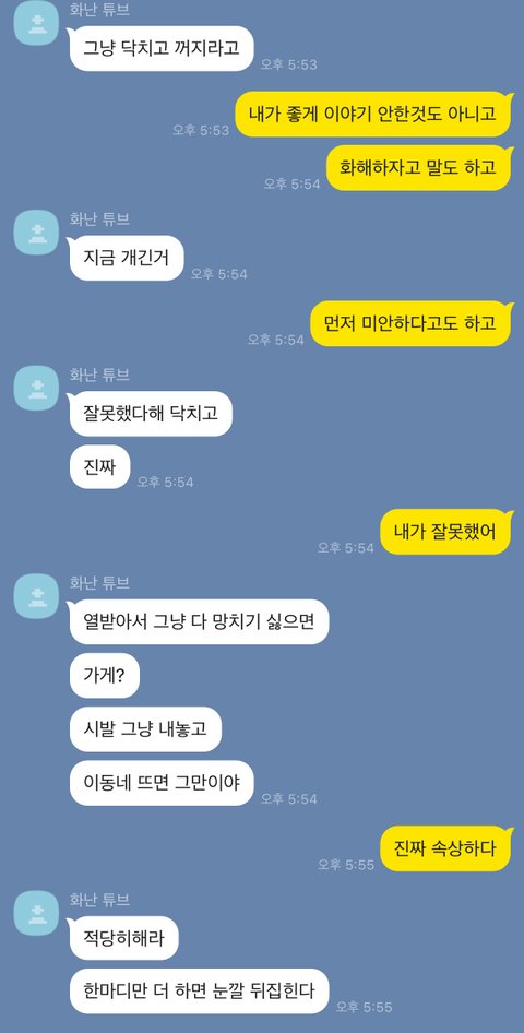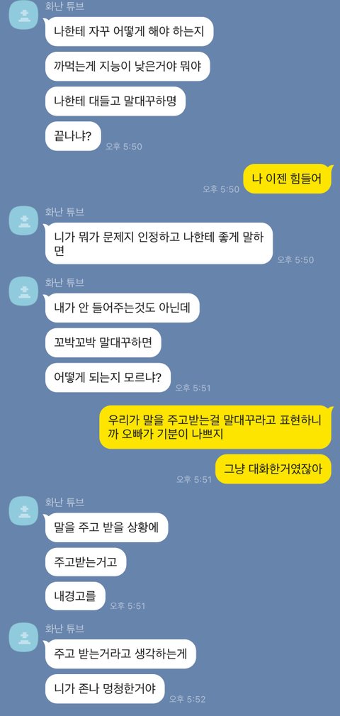 뭐 이 얘기는 지나간 일이니 차치하고 제가 댓글들 보고 남자친구랑 다시 대화하면서 화가 나거나 그러면 먼저 대화를 시도했으면 좋겠다고 날벼락처럼 갑자기 화를 불같이 내는 건 좋지 않은 것 같다고 말했어요. 저한테 그렇게 바라는 게 많으면 조건에 맞는 남자를 찾아 떠나라고 하더군요... 자기는 말 잘듣는 여자 충분히 구할 수 있을 것 같으니 각자 길 가자고..